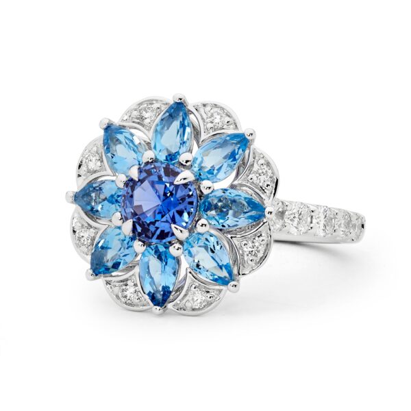 View Product: Blue Sapphire & Aquamarine Flower Cluster Ring