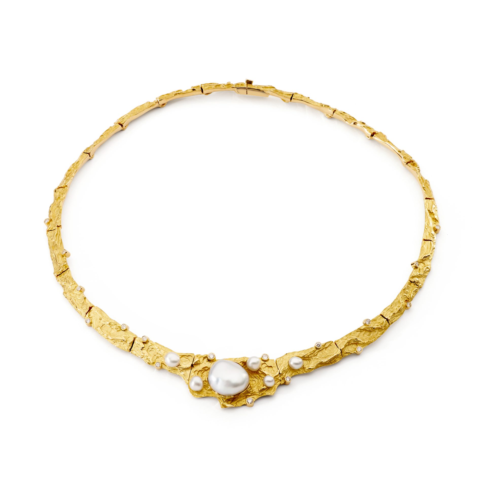The Anastasia’s Pool Collier is set in 18ct yellow gold and features fourteen brilliant cut diamonds (14=0.035ct G/SI) and six stunning Australian South Sea keshi pearls that are a smooth baroque shape with excellent lustre.