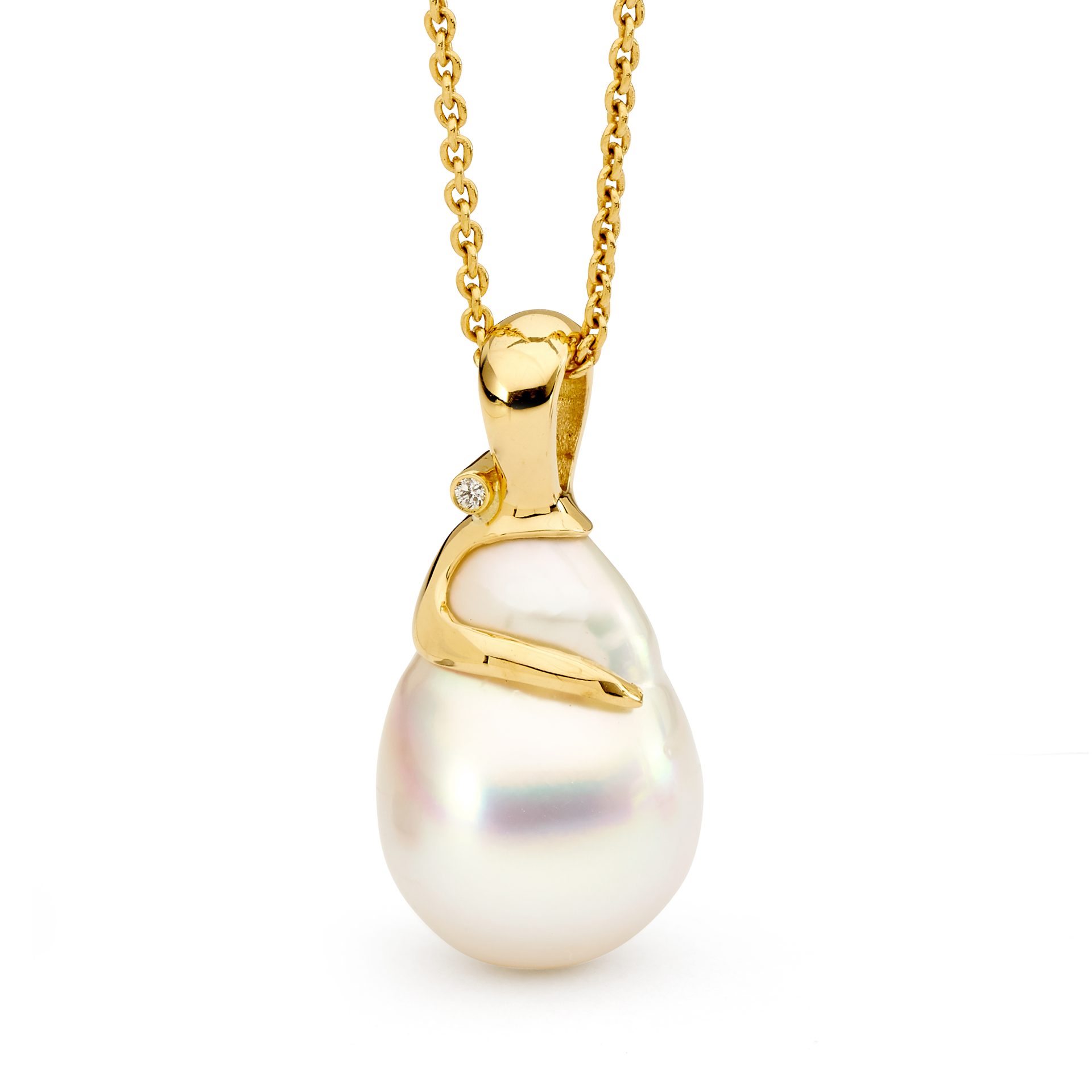 Handcrafted in 18ct yellow gold, this beautiful pendant features a lustrous 19x14mm Australian South Sea baroque pearl and is set with a 0.015ct G/SI round brilliant cut diamond.