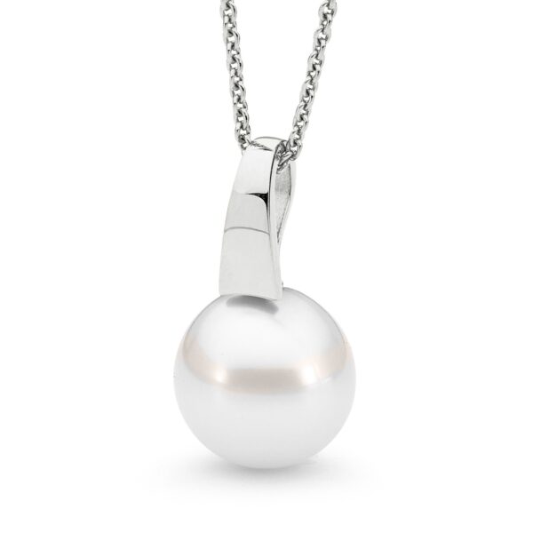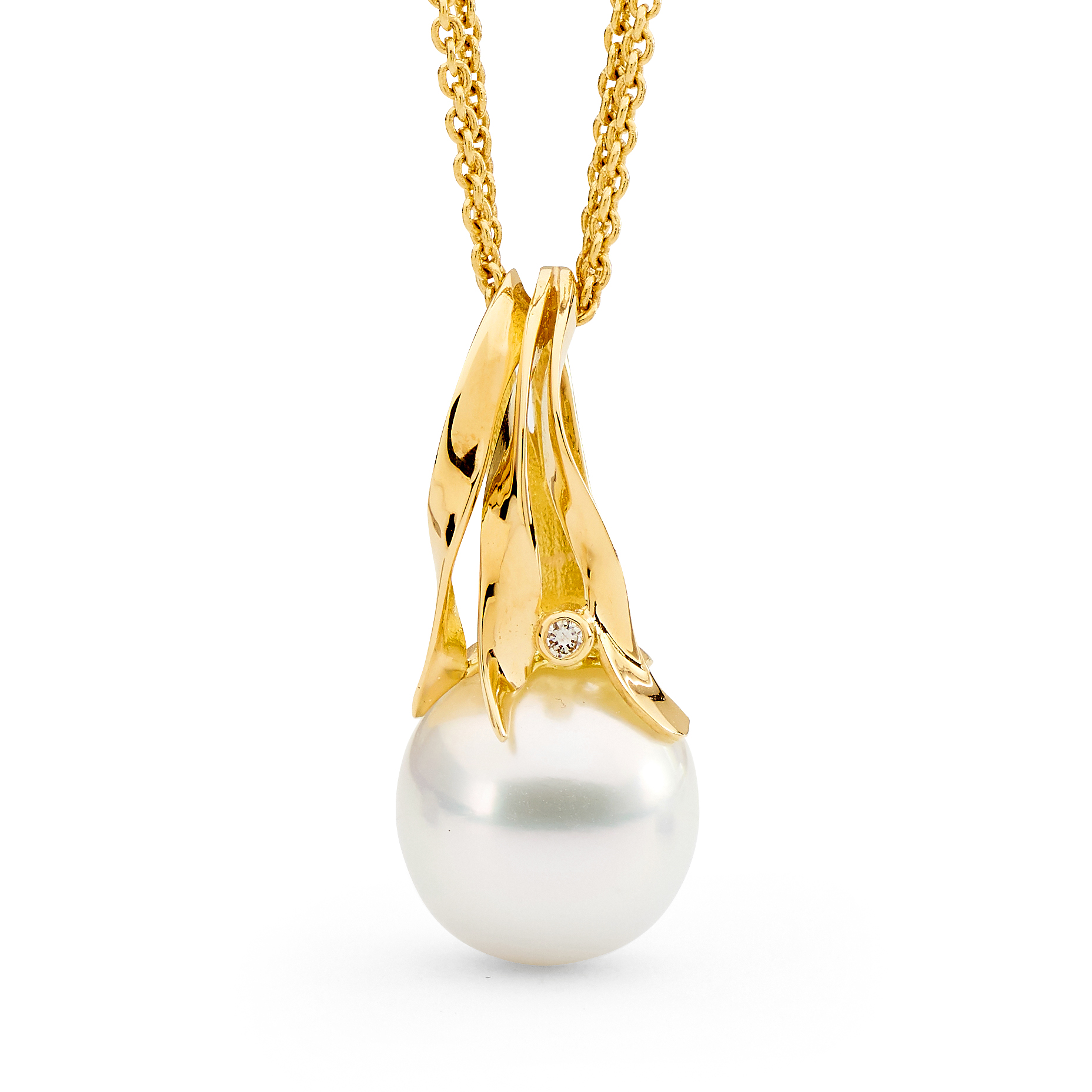 Set in 18ct yellow gold, this pendant includes 1x 0.035ct G/SI round brilliant cut diamond and features a lustrous 12-13mm oval/drop white South Sea cultured pearl.
