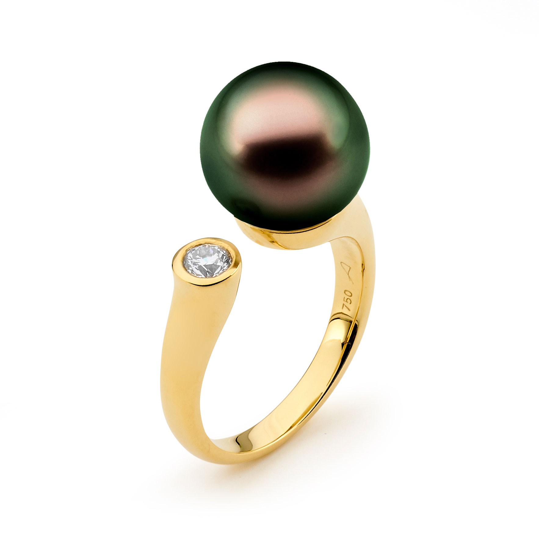 Set within an 18ct gold split face, the Bezel Set Diamond and Pearl Ring features a 10-11mm South Sea button pearl with excellent lustre, and one (0.19ct G/SI) bezel set diamond. Price displayed applies to
