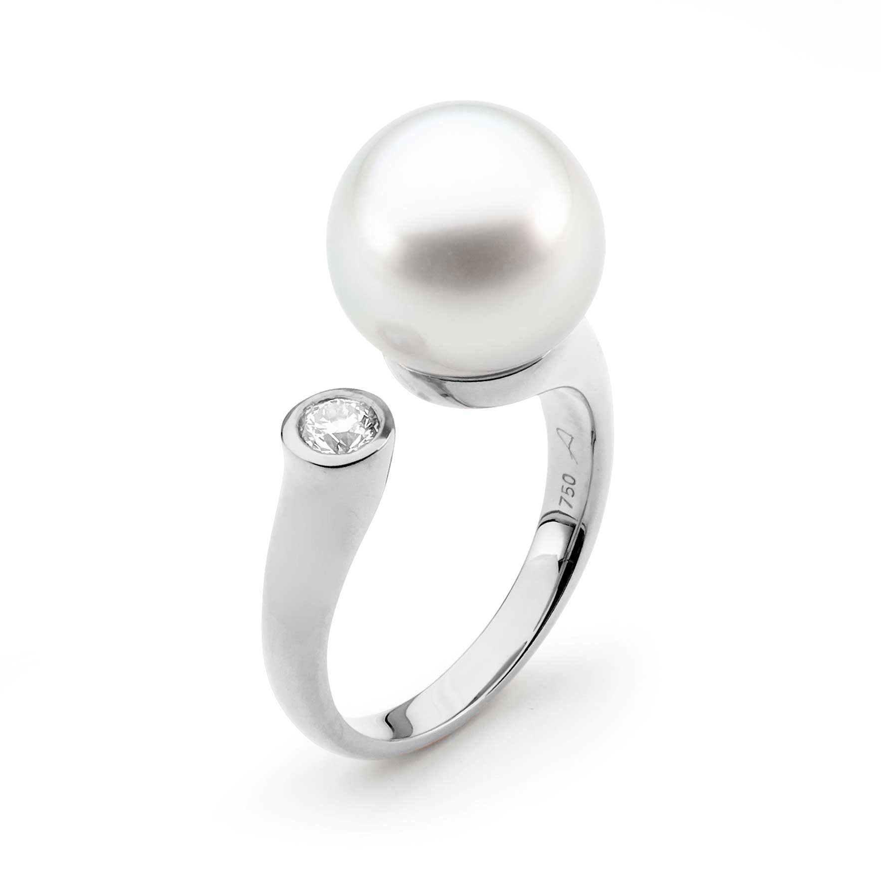 Set within an 18ct gold split face, the Bezel Set Diamond and Pearl Ring features a 10-11mm South Sea button pearl with excellent lustre, and one (0.19ct G/SI) bezel set diamond.