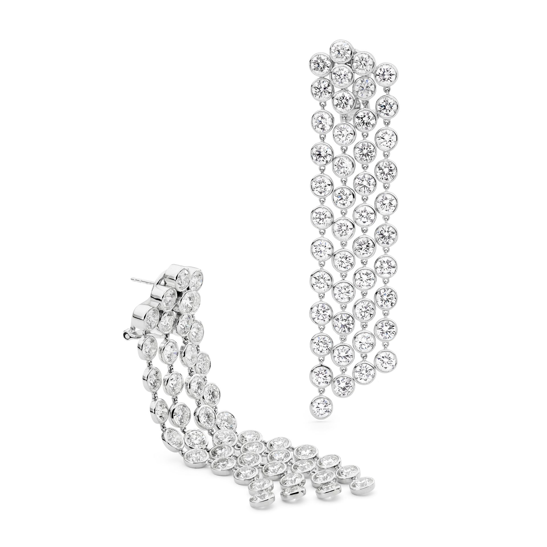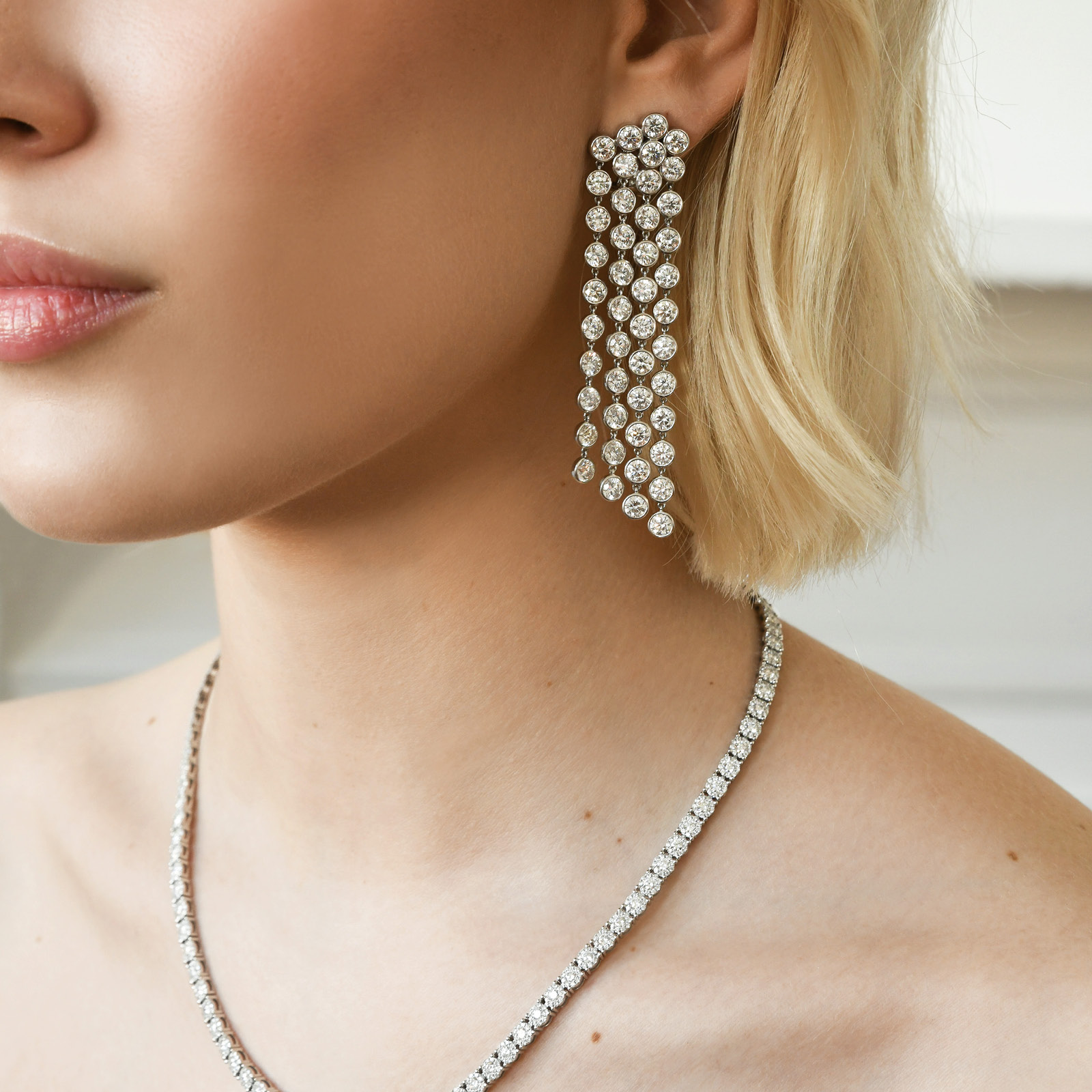 These incredible 18ct white gold Chandelier Diamond Earrings feature 90=21.09ct G/SI round brilliant cut bezel set diamonds, they are truly breath-taking.