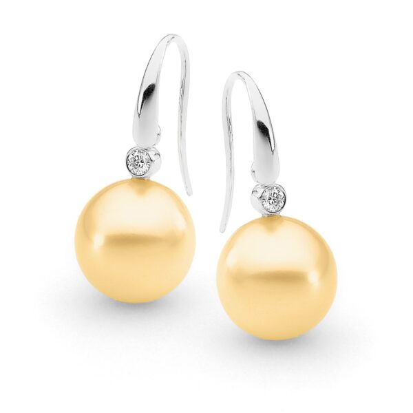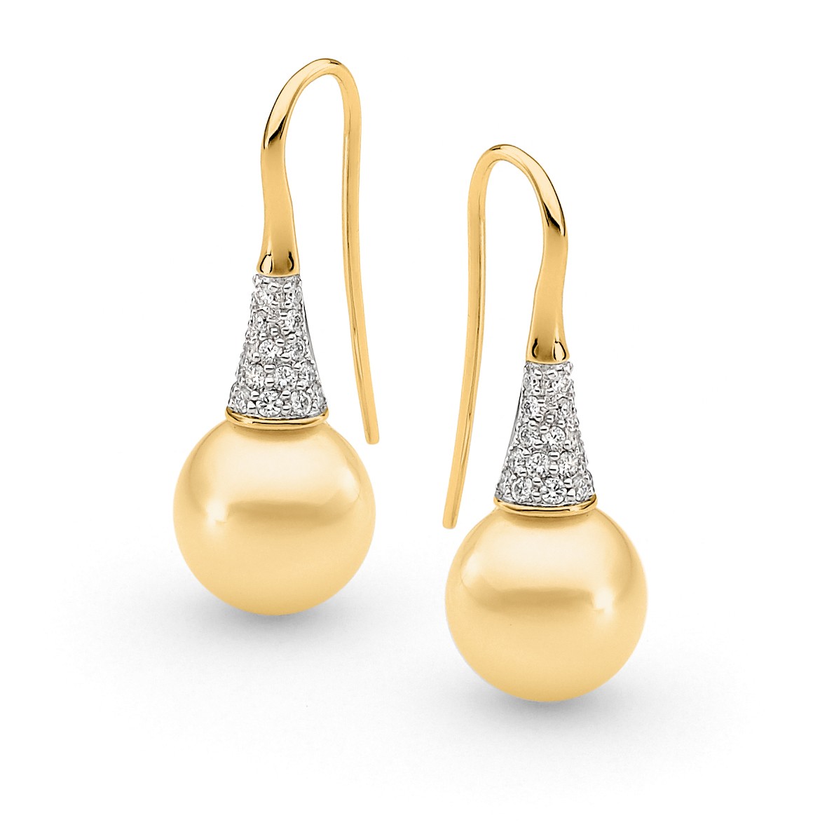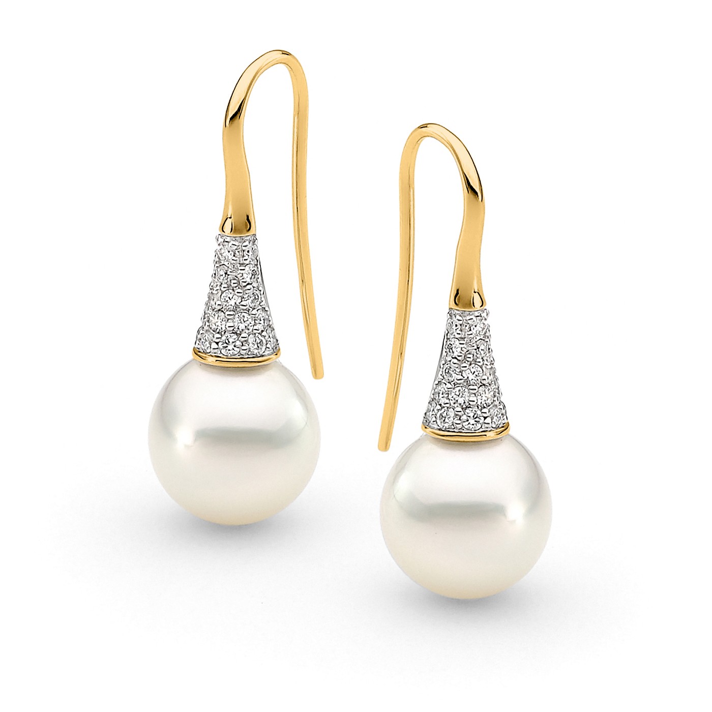These lovely fluted French hook earrings are set in 18ct gold and feature white (0.54ct) diamonds and lustrous 12-13mm oval/drop white South Sea pearls. Available in 18ct yellow or white gold, with three pearl colour
