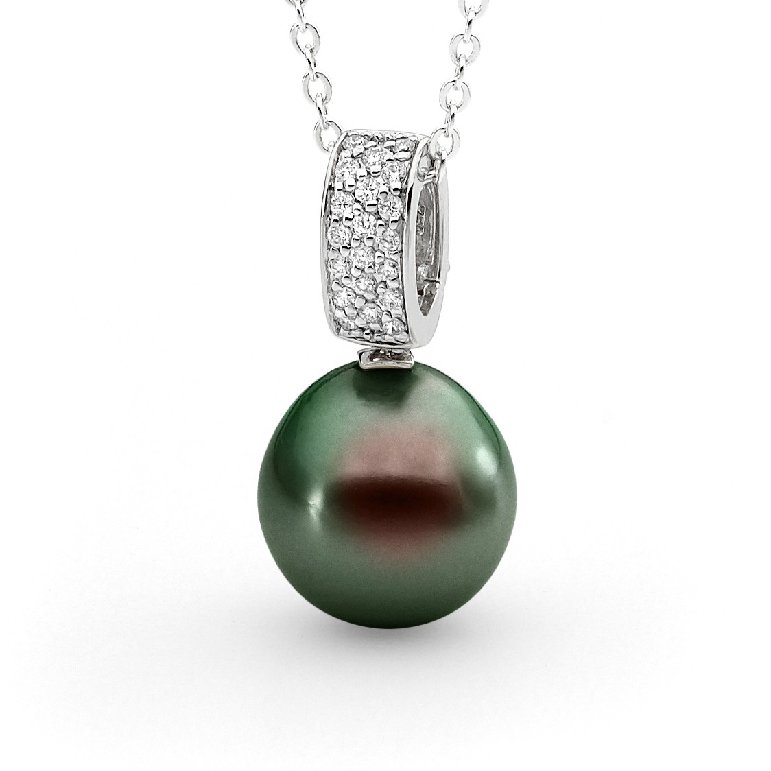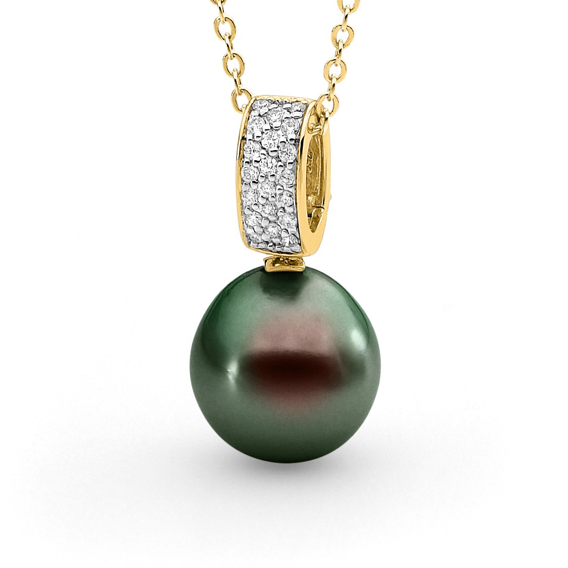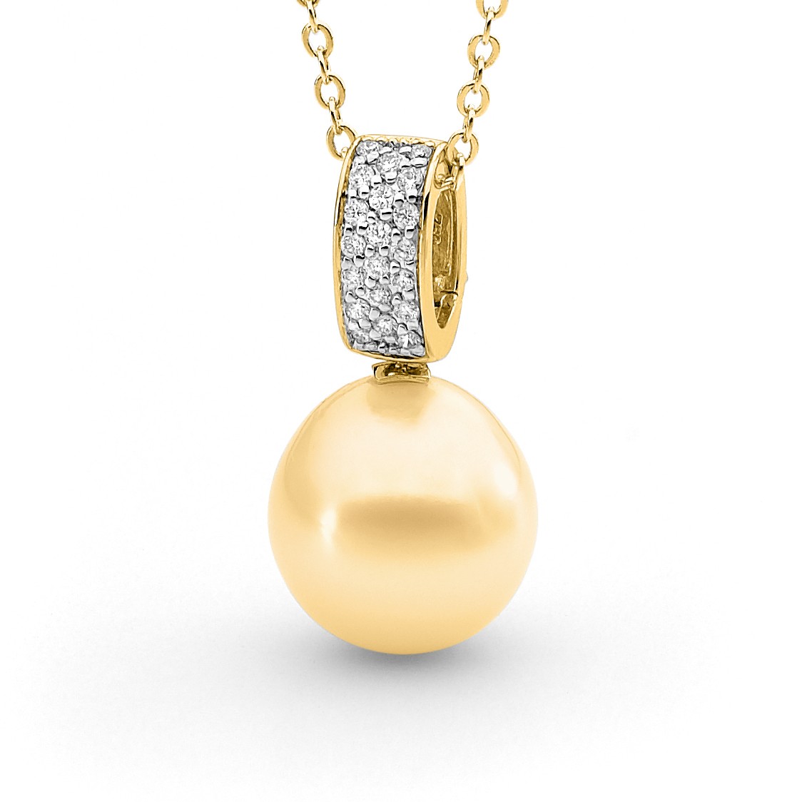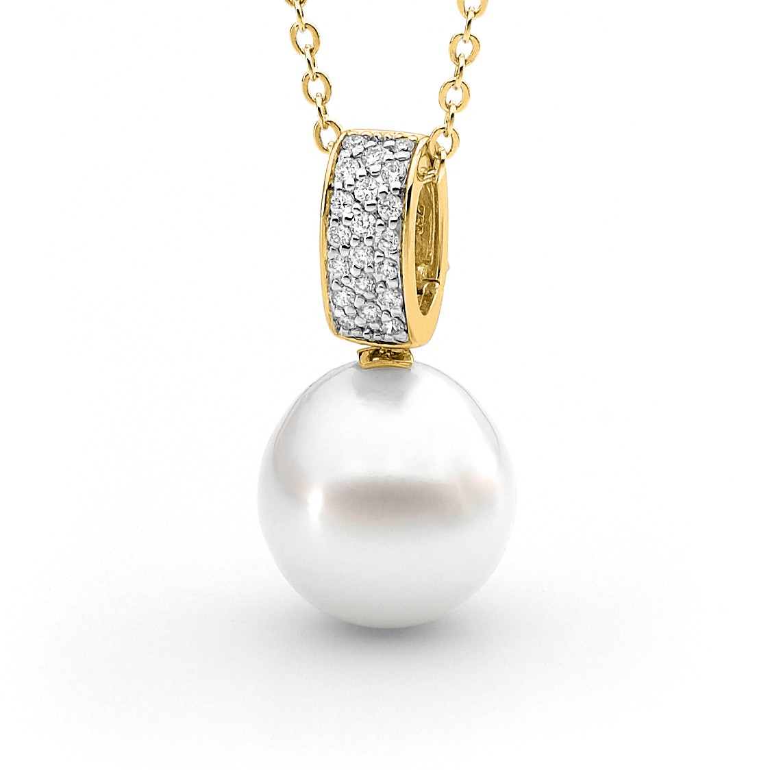 Set in 18ct gold, this pavé diamond hinged enhancer pendant features a lustrous 13-14mm oval/drop South Sea cultured pearl and 20=0.20ct G/SI pavé set diamonds. Available in 18ct yellow or white gold, with three pearl