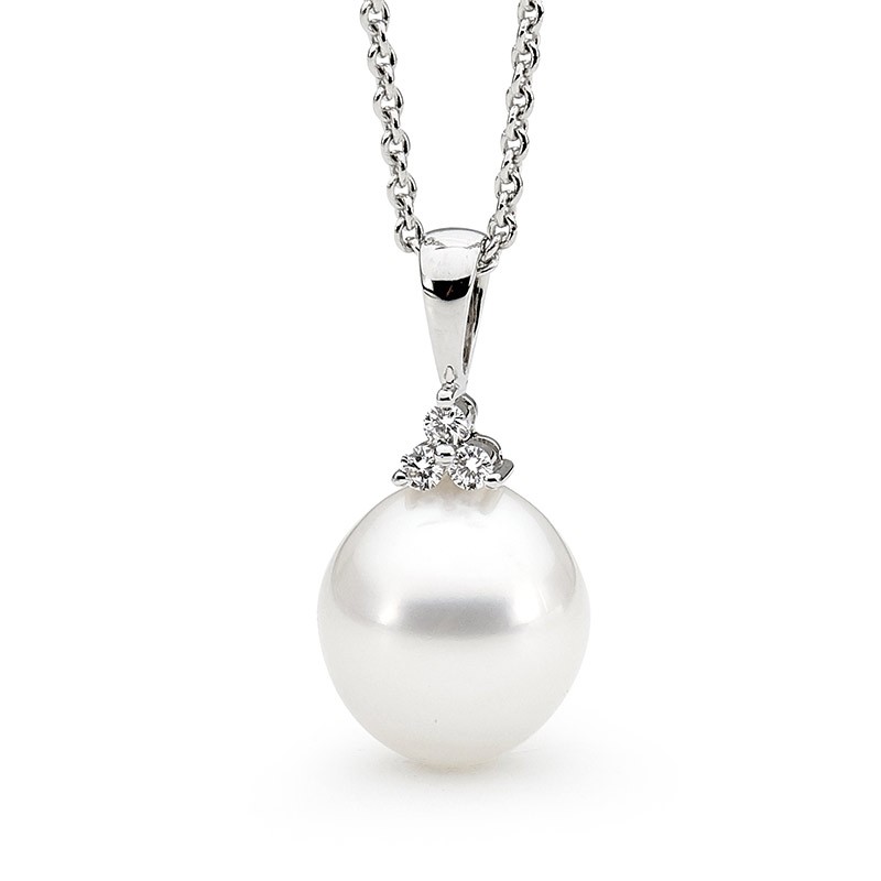 A classic and timeless design, this trio diamond pendant includes 3=0.08ct G/SI diamonds and features a lustrous oval/drop South Sea pearl.