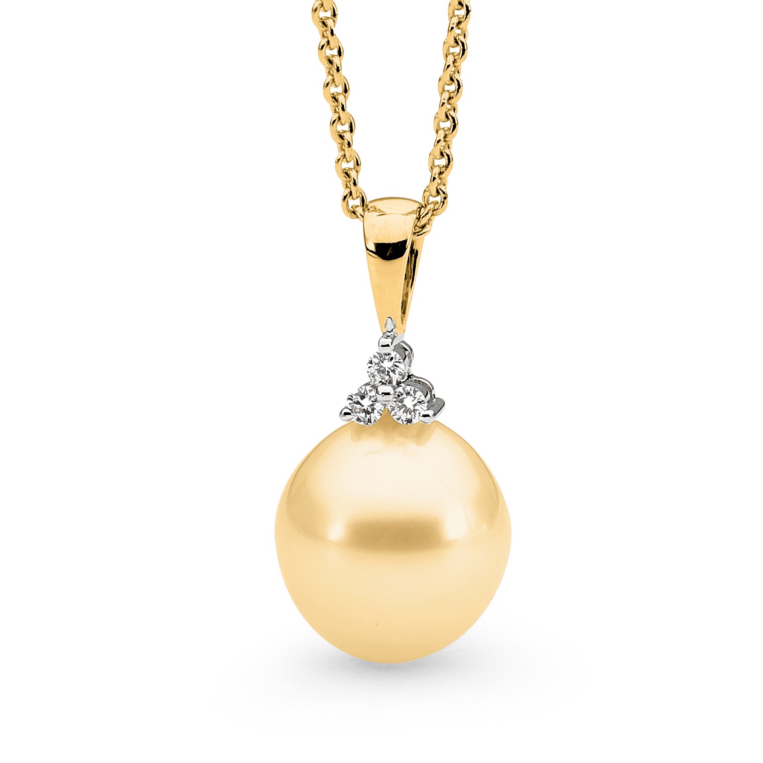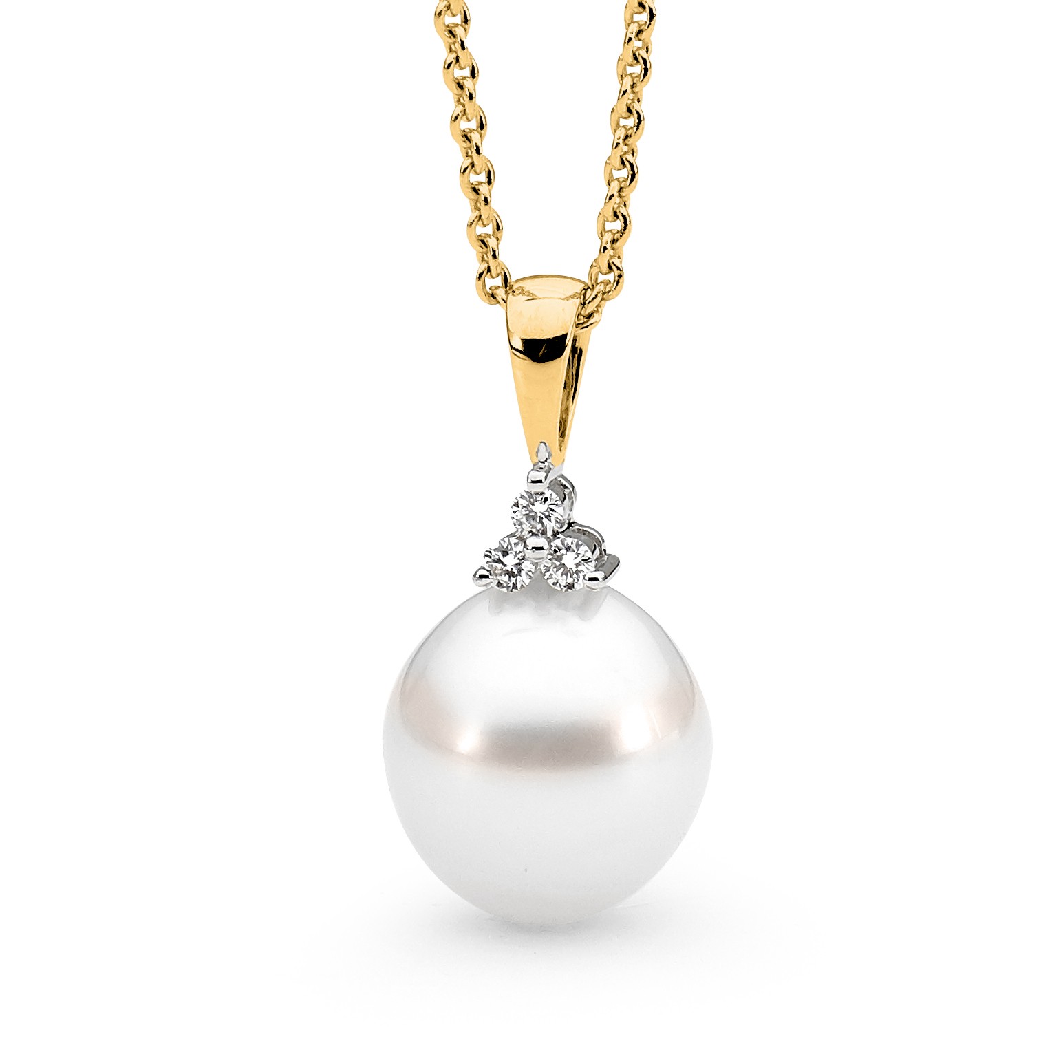 A classic and timeless design, this trio diamond pendant includes 3=0.08ct G/SI diamonds and features a lustrous oval/drop South Sea pearl. Available in 18ct yellow or white gold, with three pearl colour variations. Please select