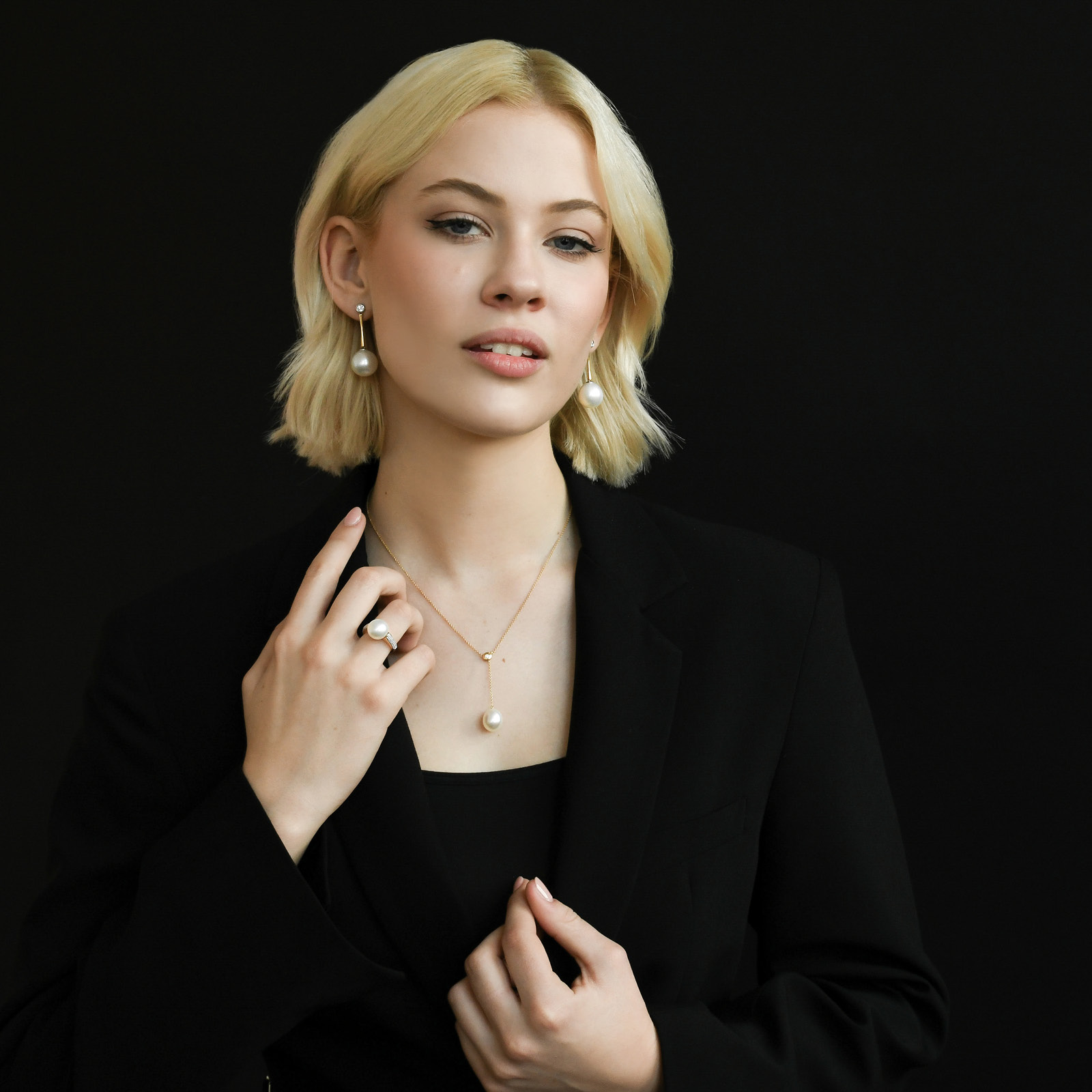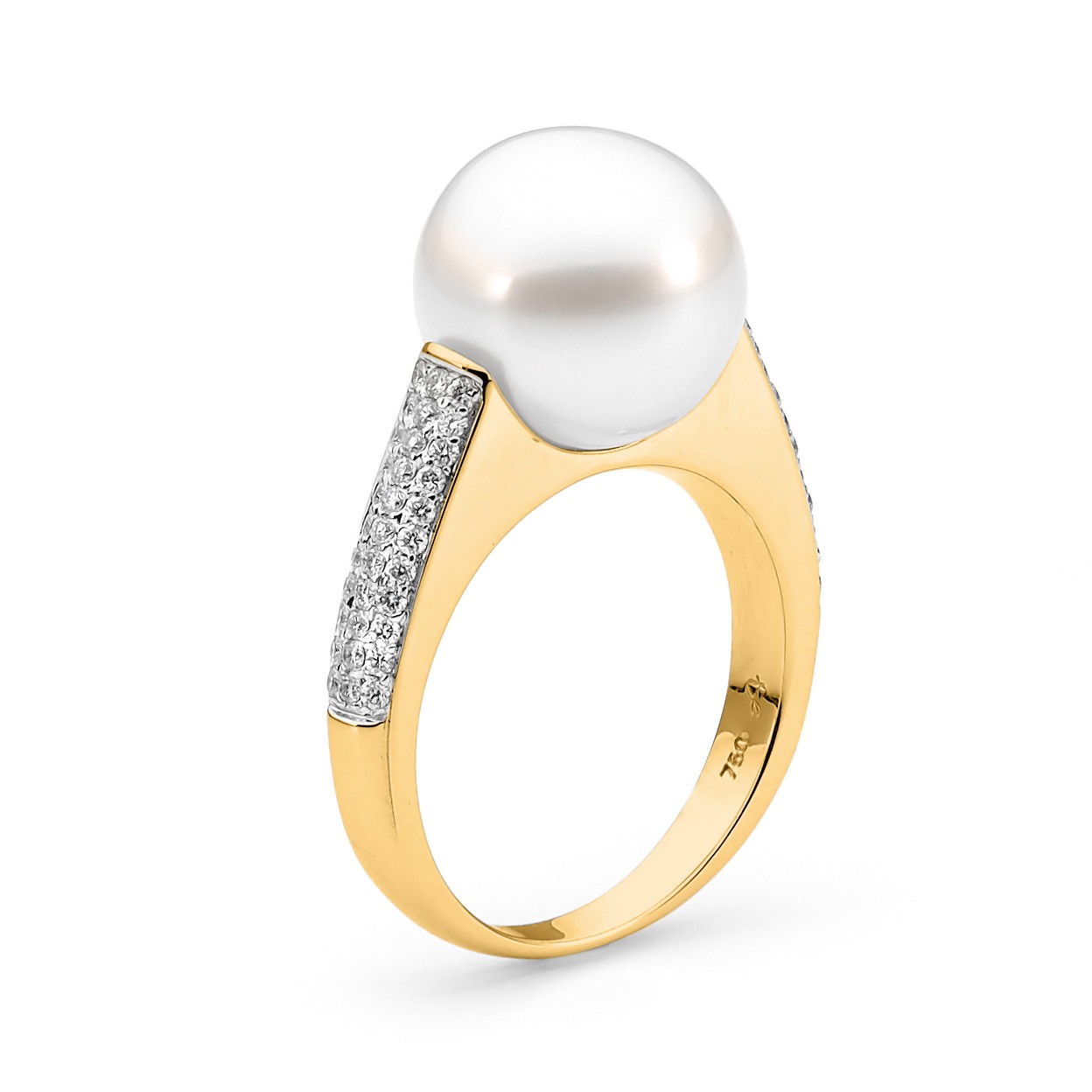 This beautiful ring is set in 18ct yellow gold, featuring 66=0.33ct G/SI white diamonds and a radiant 11-12mm button white South Sea pearl.