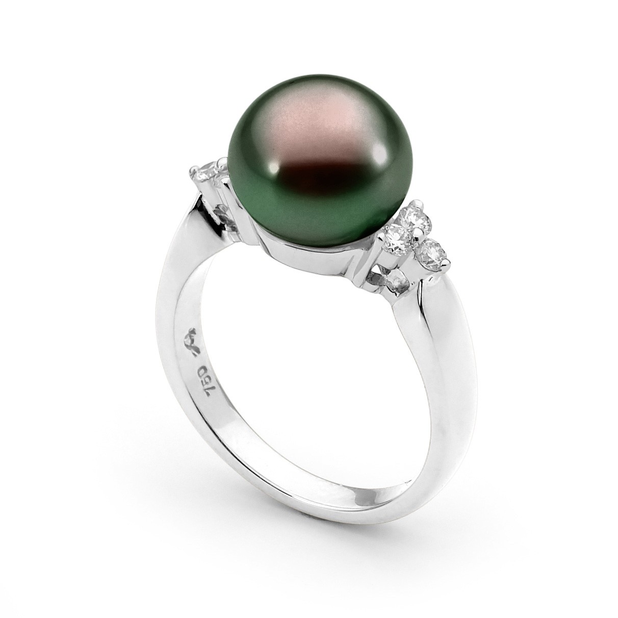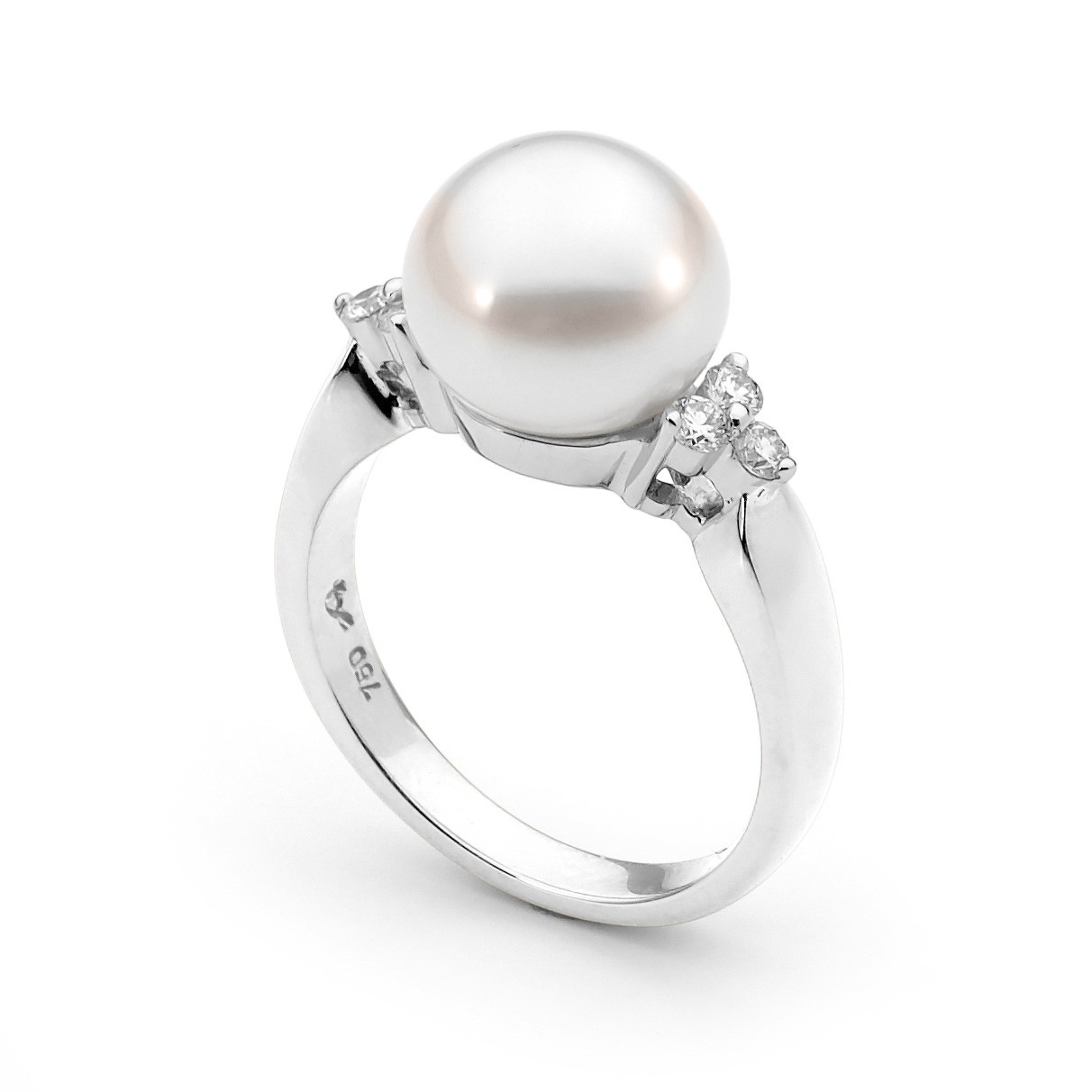 This lovely ring is set in 18ct gold, featuring a trio of white (3=0.10ct) diamonds either side totalling (6=0.20) and a lustrous 10-11mm button white South Sea pearl.