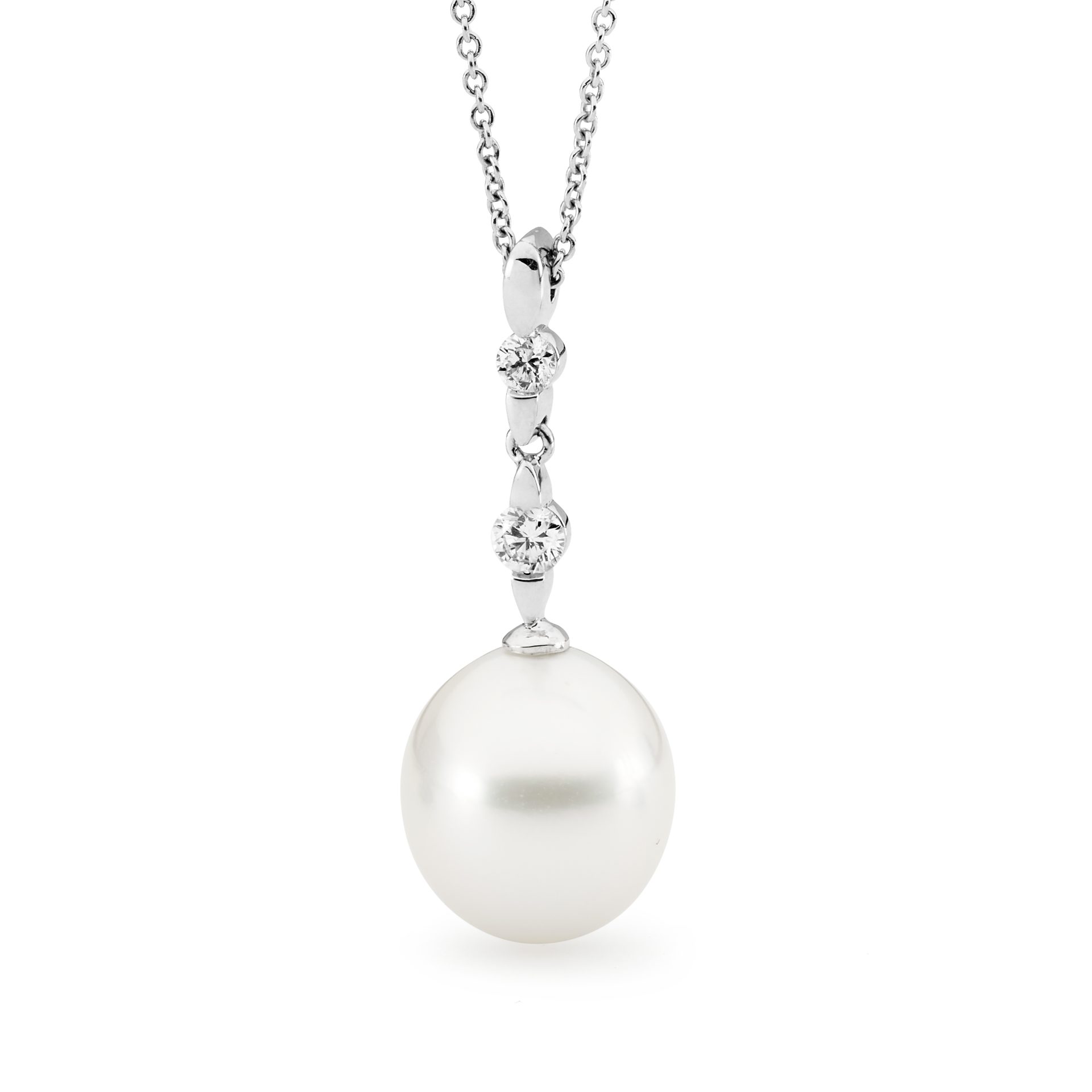Set in 18ct white gold, this gorgeous diamond set pendant features 2x round brilliant cut diamonds (0.10ct and 0.17ct G/SI) and a lustrous 12-13mm white oval/drop Australian South Sea cultured pearl. White gold diamond cut