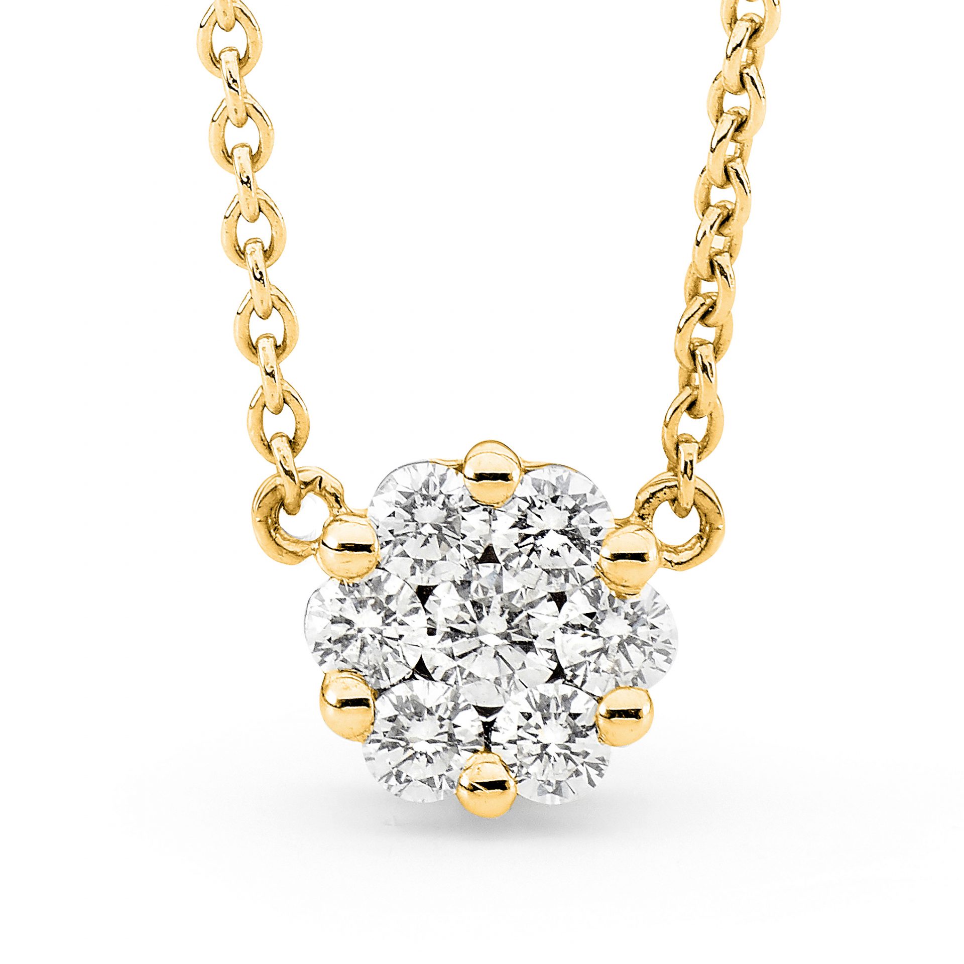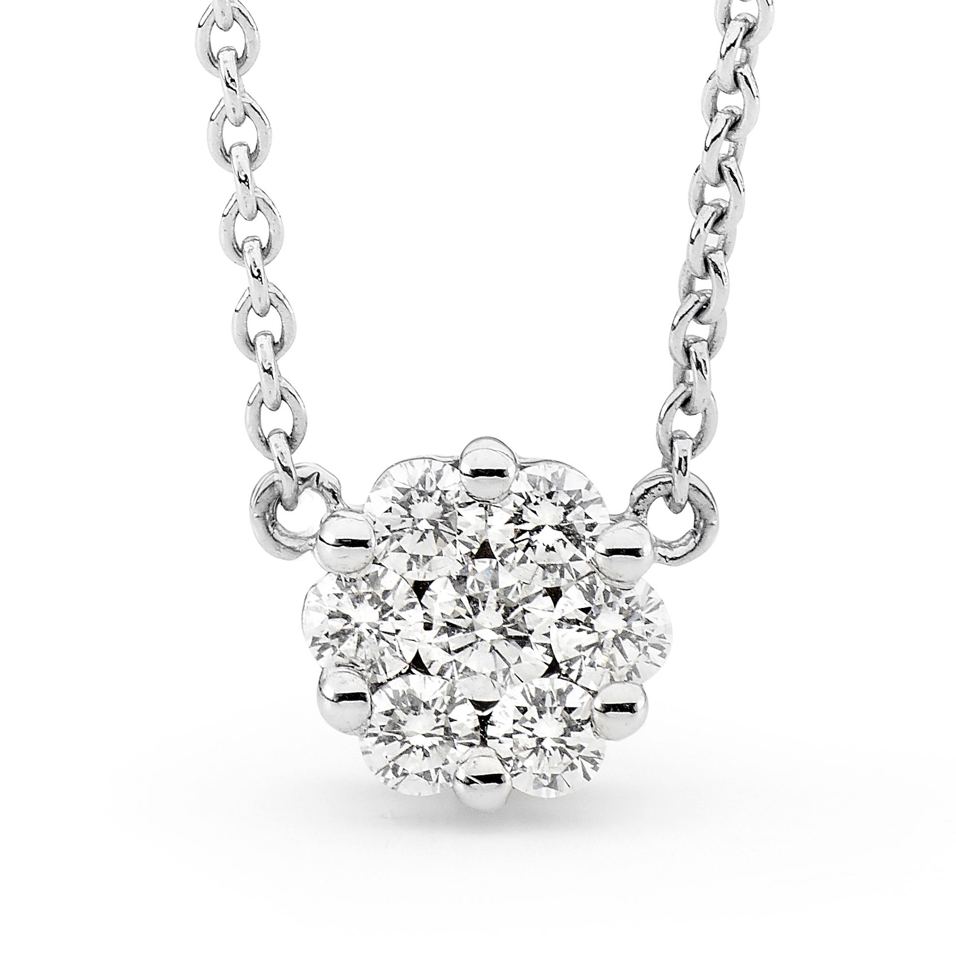 Set in 18ct white or yellow gold, this necklace features 7 (=0.25ct G/SI) round brilliant cut diamonds in a 6-prong flower setting.