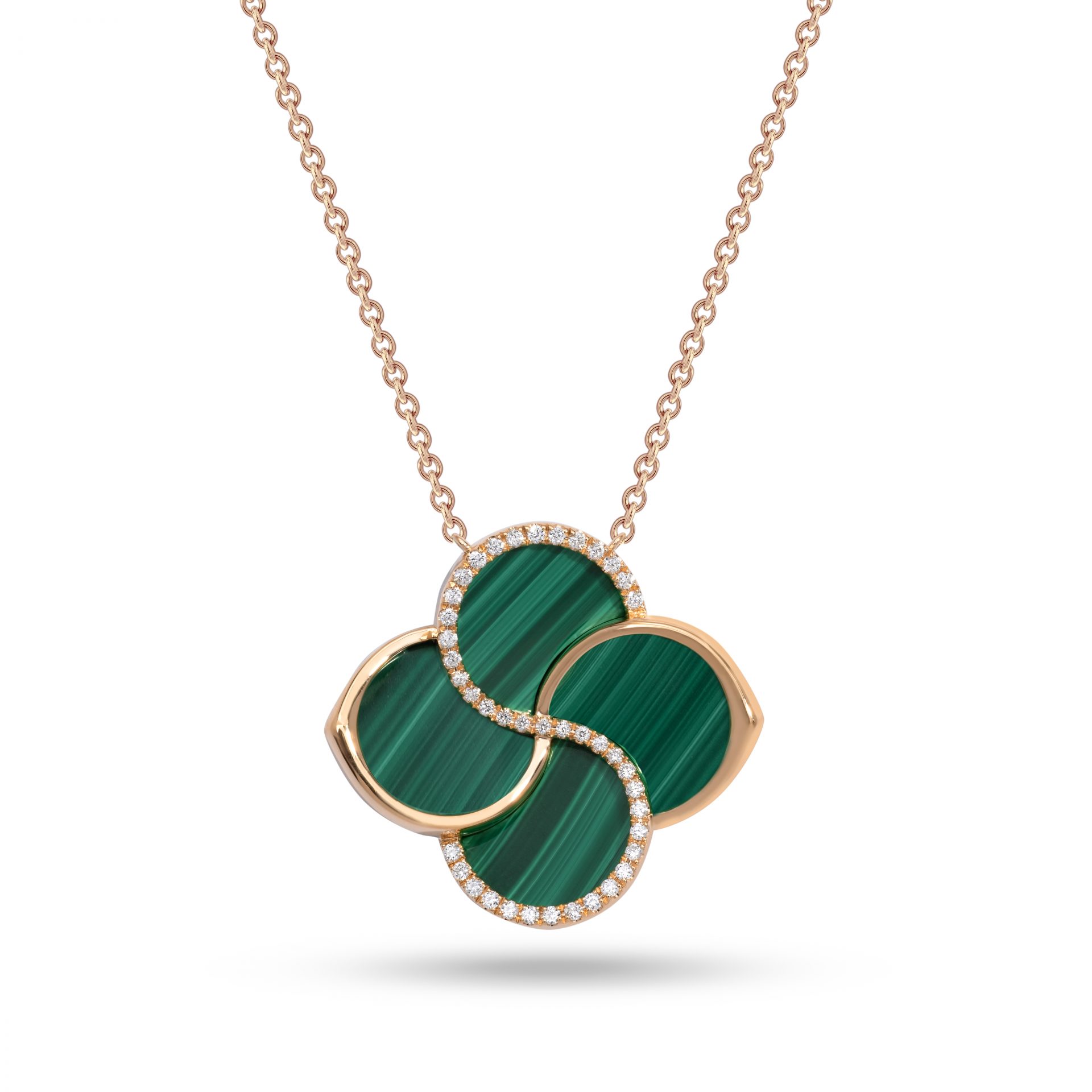 This 18ct yellow gold necklace features four Malachite inlays and 41=0.18ct G/VS round brilliant cut diamonds.