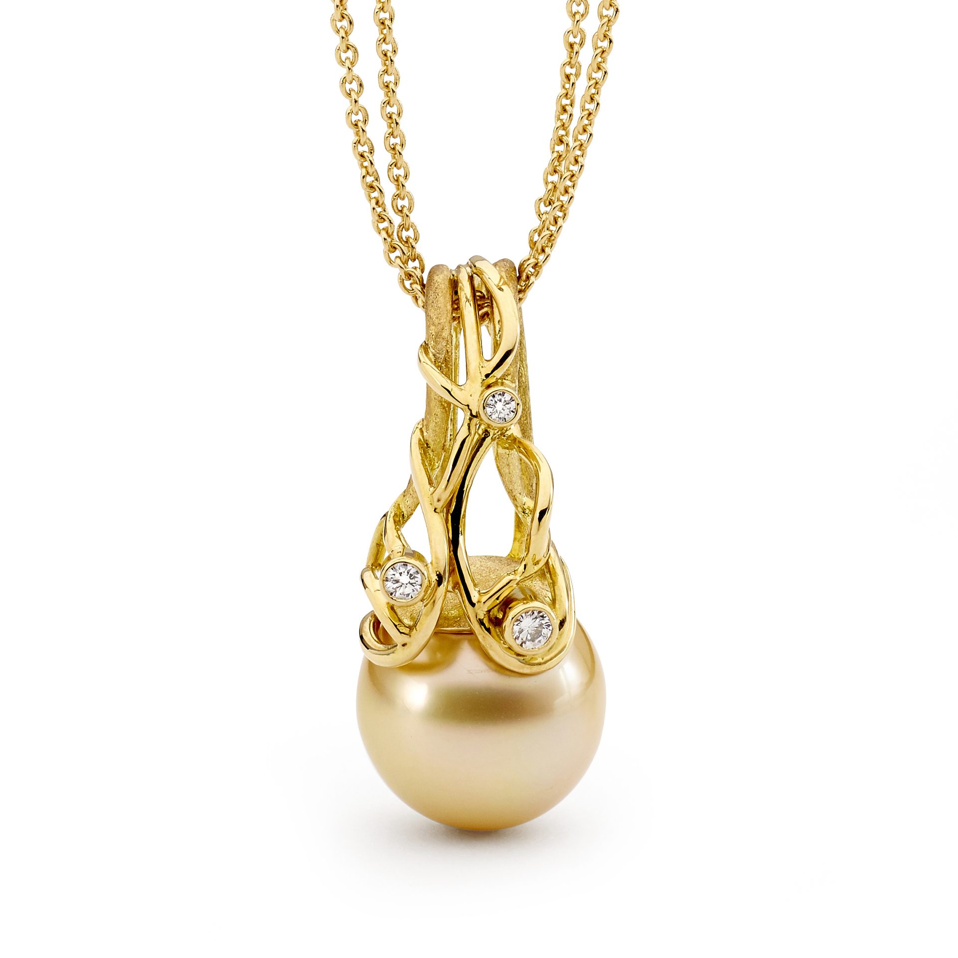 Set in 18ct yellow gold, the Mangrove Gold Pendant features a lustrous 15.8mm button shaped intense gold South Sea cultured pearl, and three round brilliant cut diamonds (3=0.18ct G/SI).