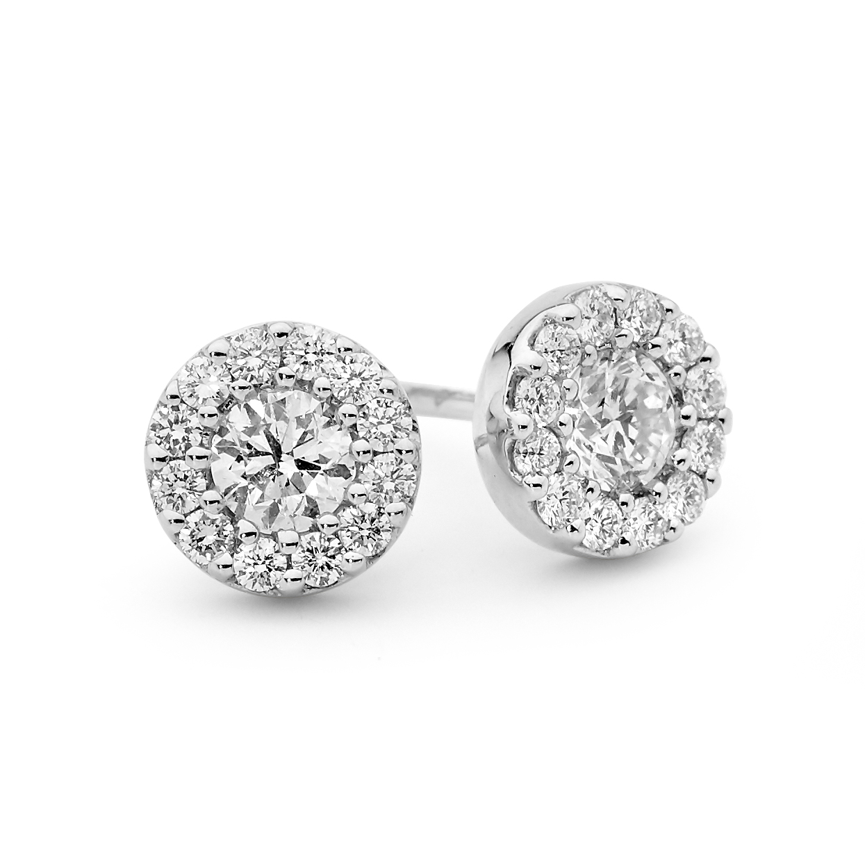 Set in 18ct white gold, the Round Halo Diamond Stud Earrings feature a round diamond centre stone, surrounded by a sparkling halo of round brilliant cut G/SI diamonds, totalling 0.63ct.