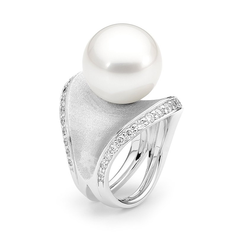 18ct white gold satin finish saddle ring with pave diamond (38=1.06ct) set rails featuring a 15.8mm near round white Australian south sea pearl.