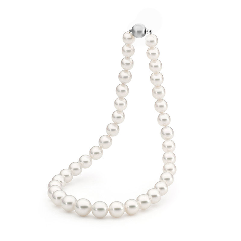 This 37 piece (10mm – 13mm) near round Australian South Sea white pearl strand is individually hand knotted and features an 18ct white gold polished Allure ball clasp.