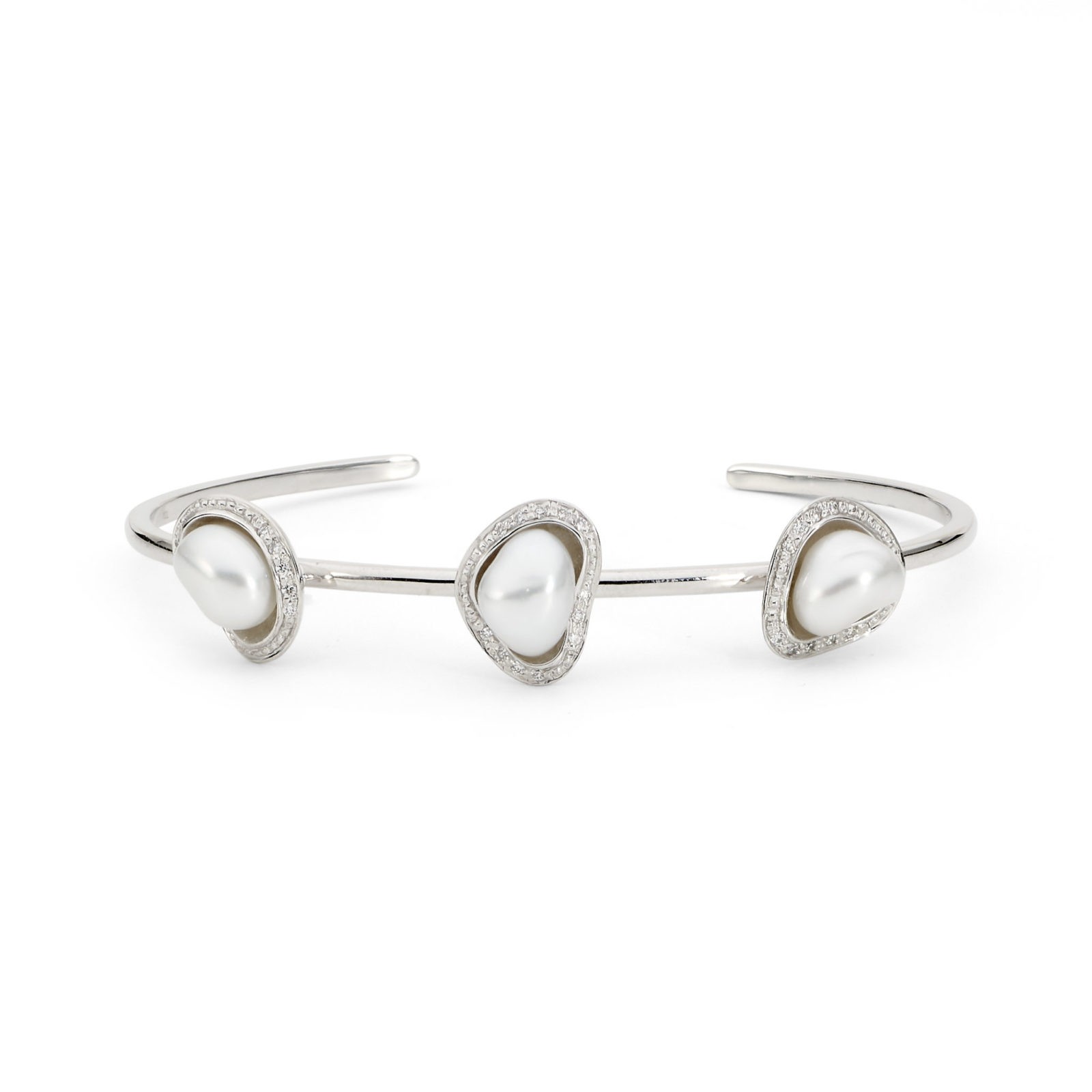 Inspired by the beautiful Clerke reef atolls which lie 270km off the coast of Broome, this exquisite 18ct white gold seedless pearl and diamond bangle was carefully designed to represent the set of three ‘aquariums’ that lie in the middle of the ocean making up the Rowley Shoals.