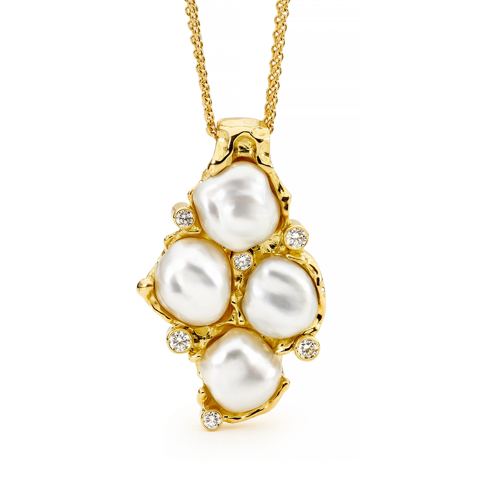 This truly unique 18ct yellow gold handcrafted pendant features four Australian South Sea seedless pearls, 10.2-12.4mm – smooth baroque shape, white colour, excellent lustre and are accented by 6=0.36ct G/SI white diamonds.