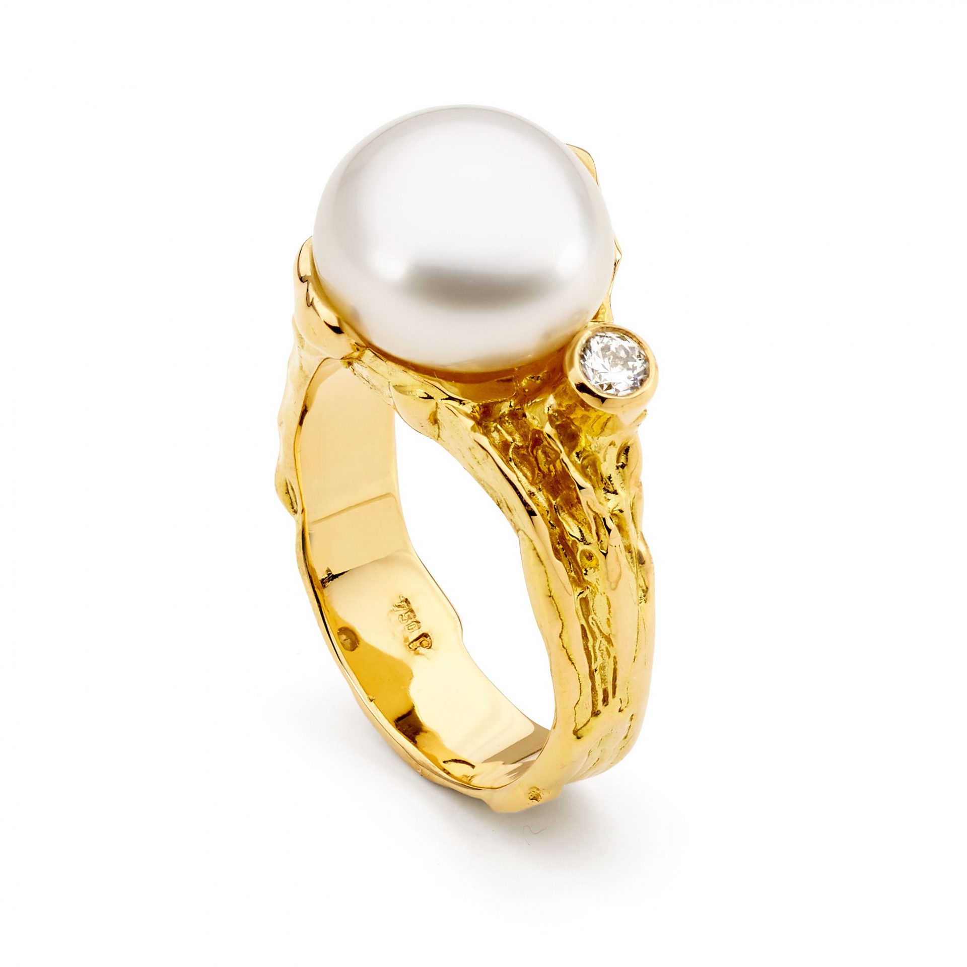 Part of the Windjana collection, this 18ct yellow gold organic style ring features 1x 10-11mm white button South Sea cultured pearl and 1x round brilliant cut diamond (0.10ct G/SI)