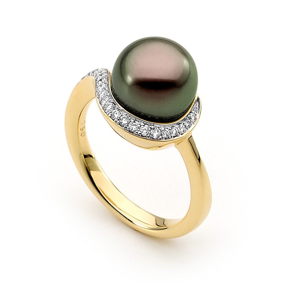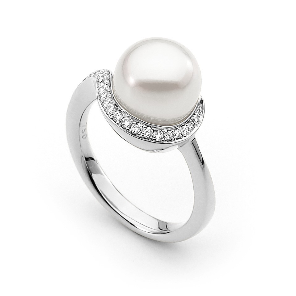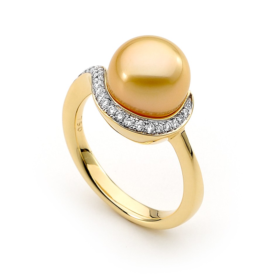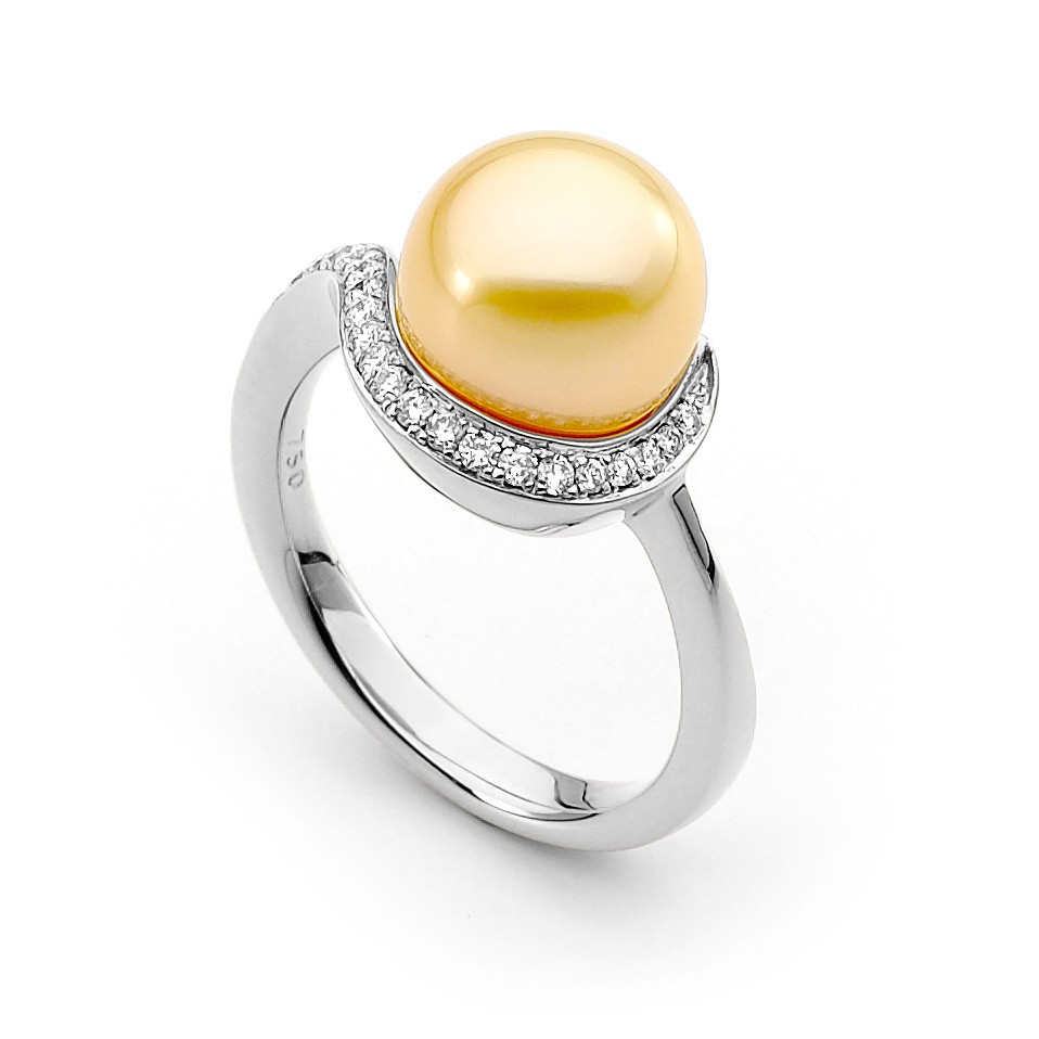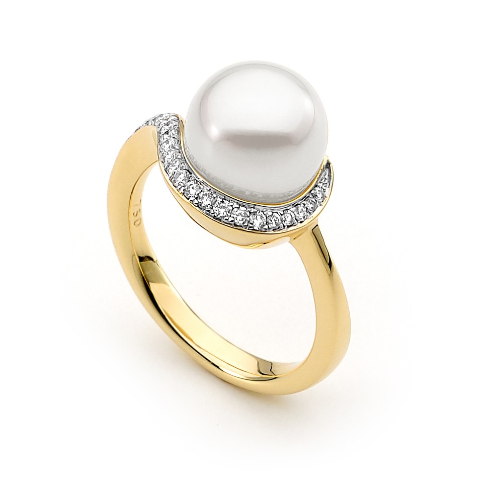 This striking ring is set in 18ct yellow or white gold, it features a lustrous 10-11mm button shaped South Sea cultured pearl and 21=0.16ct G/SI diamonds in a semi-halo setting.