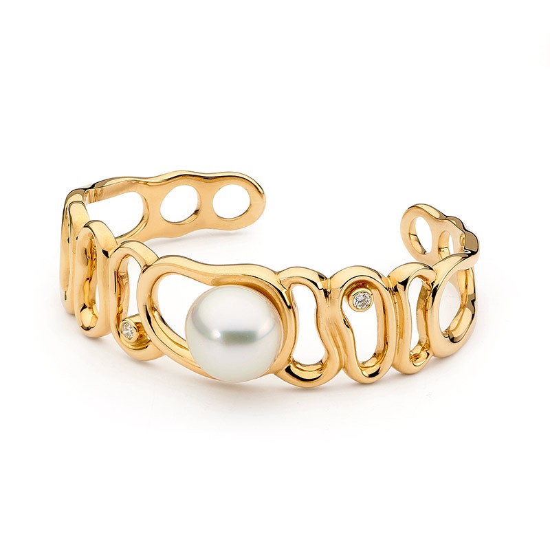 Set in 18ct yellow gold, the Dinosaur Footprints Cuff features one lustrous 14.7mm baroque Australian South Sea cultured pearls, and two (2=0.20ct G/SI) bezel set diamonds.