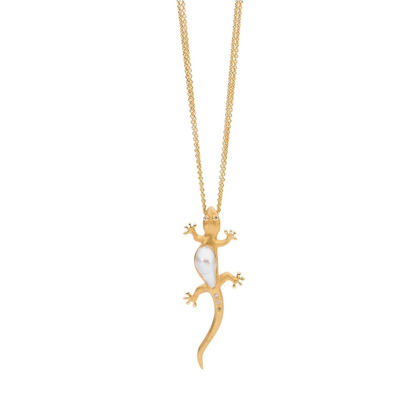 18ct yellow gold brushed finish gecko pendant featuring one 7.3 x 16.9mm drop baroque Australian South Sea cultured pearl with two 0.01ct and three 0.0067ct G/SI brilliant cut diamonds.
